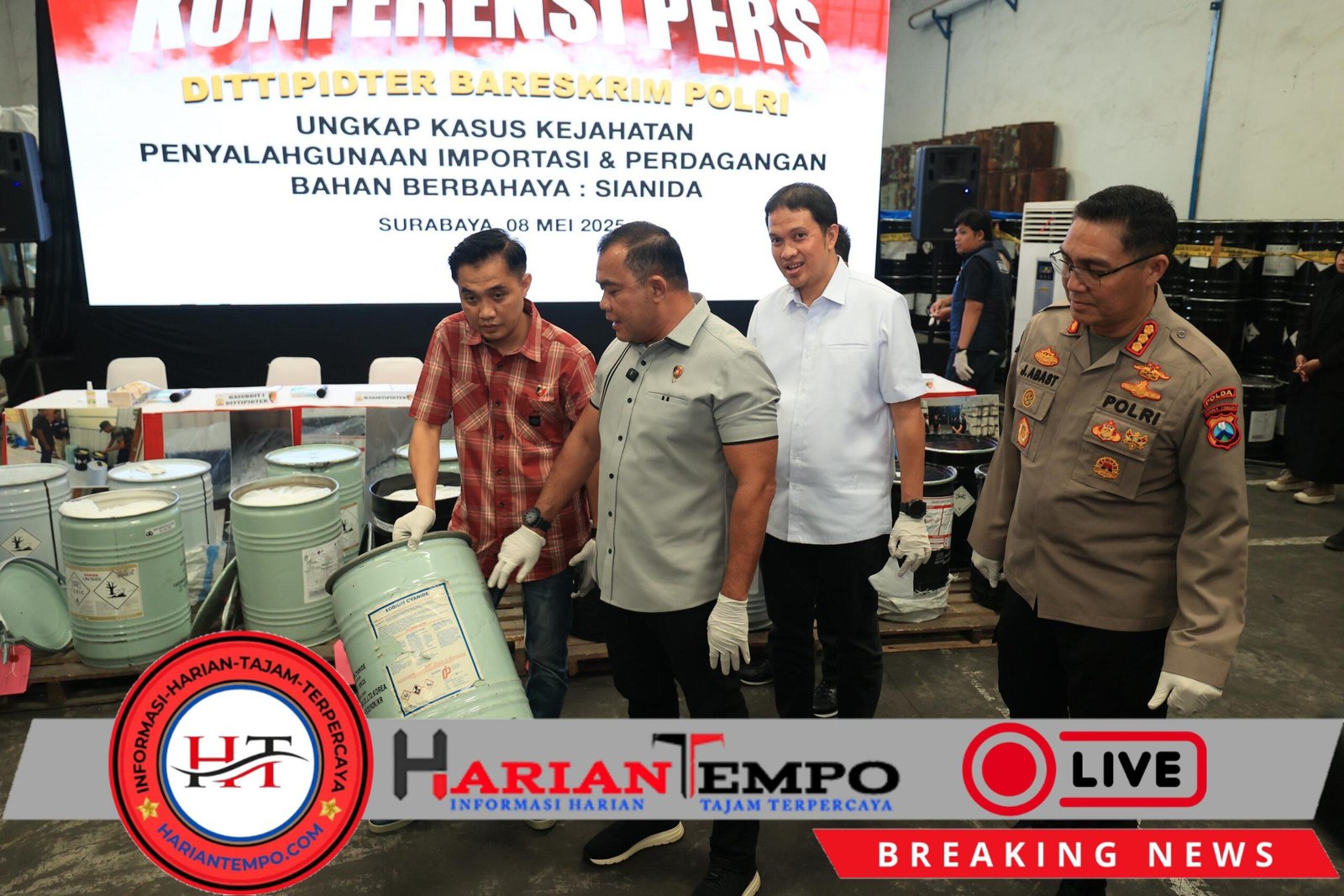 “Sementara di gudang kedua yakni di Pasuruan, Tim Bareskrim Polri mengamankan 3.520 drum sianida merek Guangan Chengxin Chemical, yang berwana telur asin,” terang Kombes Jules Abraham Abast.